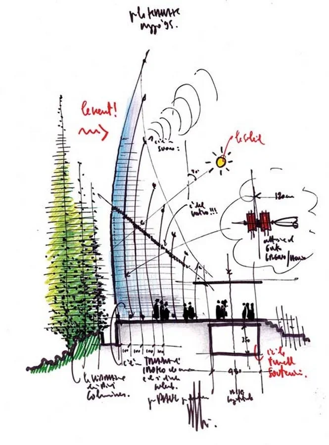 Renzo Piano Building Workshop. Hand-sketch of Jean-Marie Tjibaou Cultural Center. 1998.
